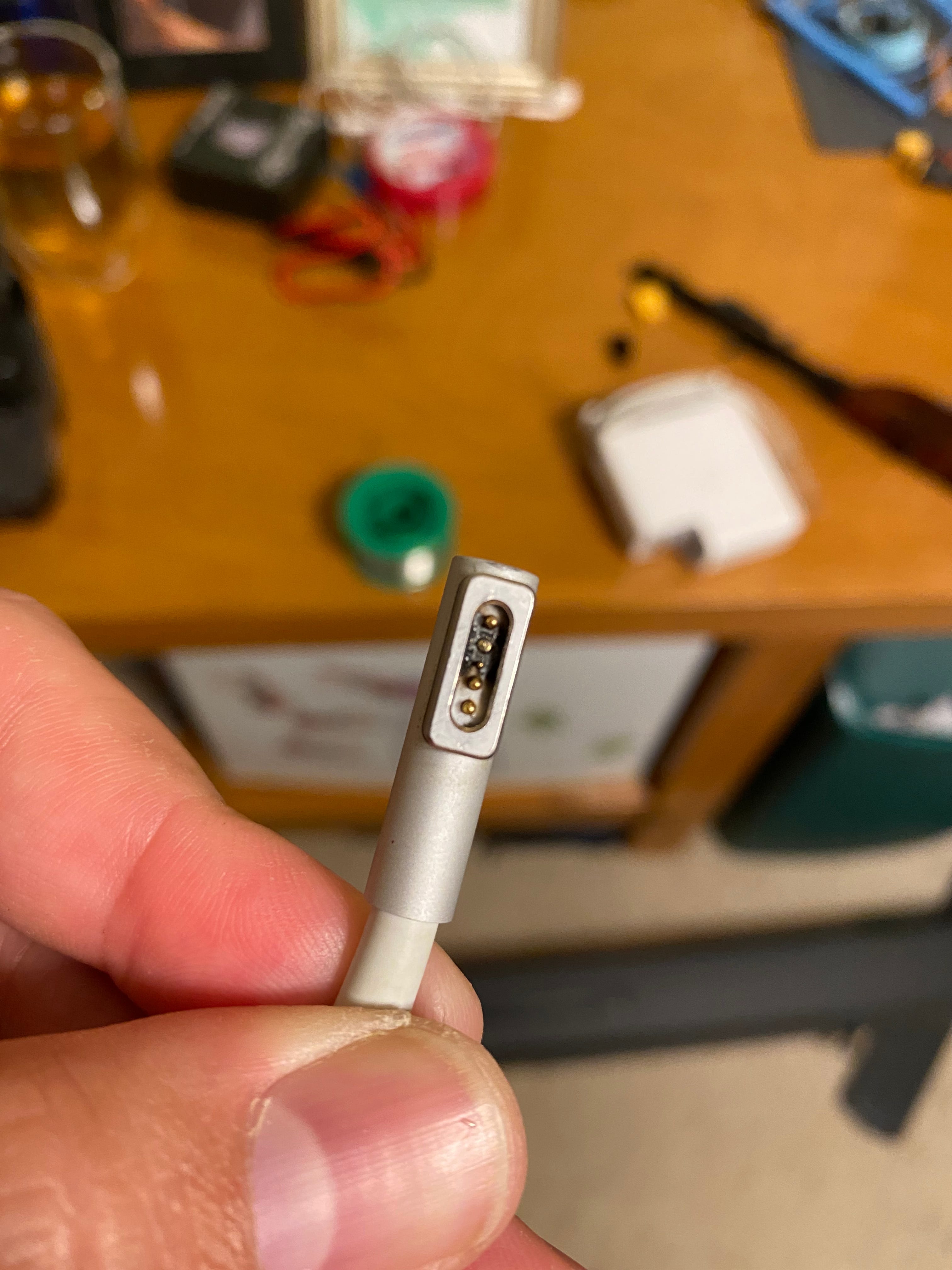 I cleaned the connector and everything seemed okay still, so I decided to test it. I connected it to my nearest MacBook. The light didn’t turn on - so clearly it didn’t work. I plugged the MacBook back in to its normal adapter…and that didn’t light up either. Uh oh.
