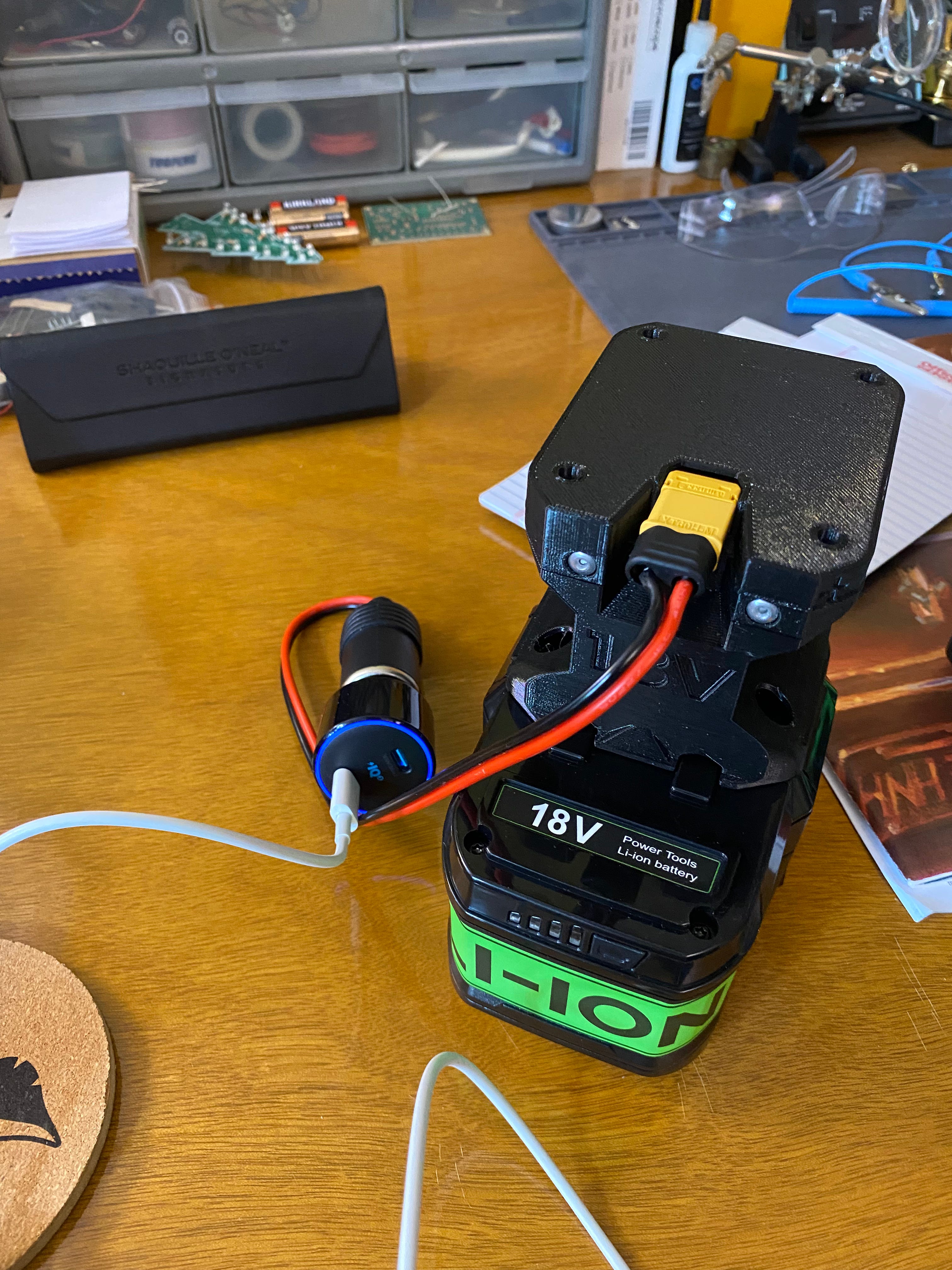 I found a 3D-printed adapter that would allow me to connect devices to a Ryobi pack using an XT60 battery connector. I also bought a 12 Volt Regulator to drop the voltage from “Ryobi Voltage” to “Car Voltage”; I also bought a car receptacle, and car USB-C adapter, connected everything together, and it worked great.